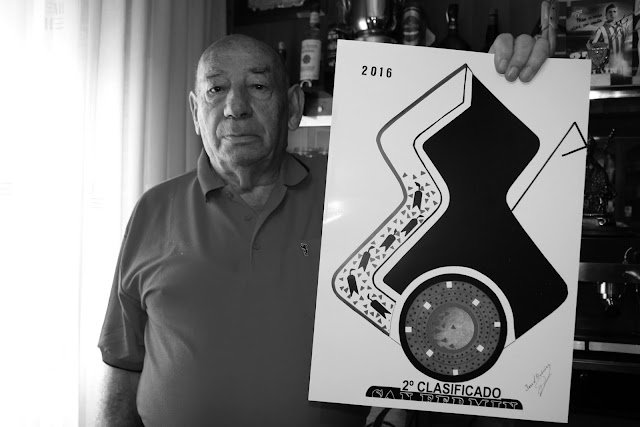 A sus 90 años, este inquieto txantreano disfruta pensando y diseñando toda clase de ingenios –es autor de numerosas patentes– y lleva años plasmando en cartulinas numerosas ideas sanfermineras. Este año ha obtenido el segundo puesto en el concurso internacional de carteles de San Fermín. Sin embargo, la inmensa alegría de ser reclamado finalista entre cerca de 400 carteles, y de encabezar desde el primer día hasta el último la votación popular, se truncó cuando en la última hora fue superado por el cartel que finalmente fue elegido ganador. «Ha sido extraño, nunca había estado tan cerca, y faltó tan poco…», reconoce ciertamente desilusionado.